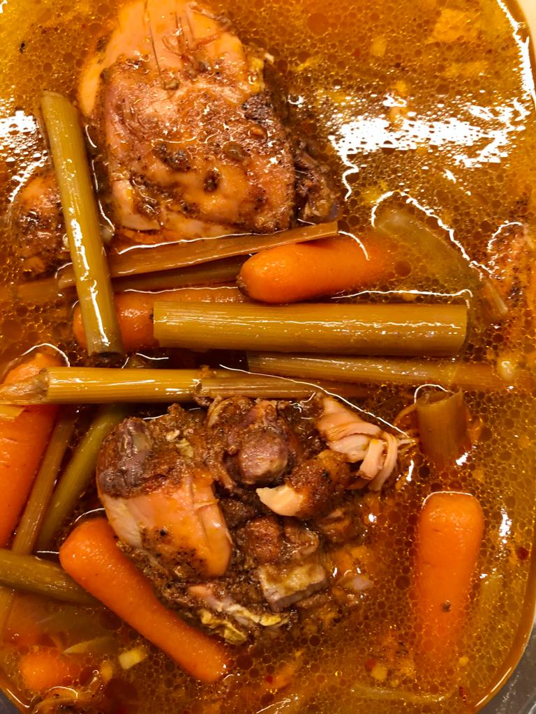 Combine skinless chicken 6-8 thighs, salt and pepper, spoon of fish sauce, mince ginger, bo kho seasoning packet (see picture). Put in plastic bag to marinade over night or in bowl for couple hours (go do laundry).