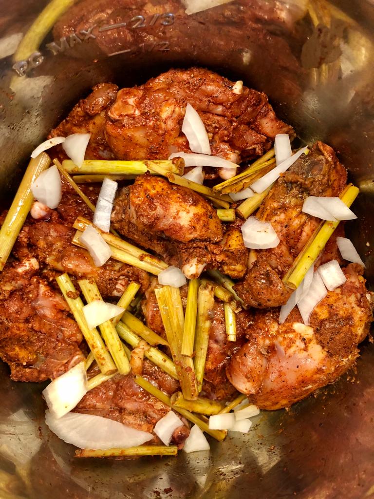 In instantpot use sauté function with some oil (we use olive oil) & 3 garlic Brown the chicken, then pour a big can of coconut water, add tsp chicken powder/aromat in to broth, add spoon of tomato paste, cut and add 1 onion into cubes, add lemongrass stalks to broth.